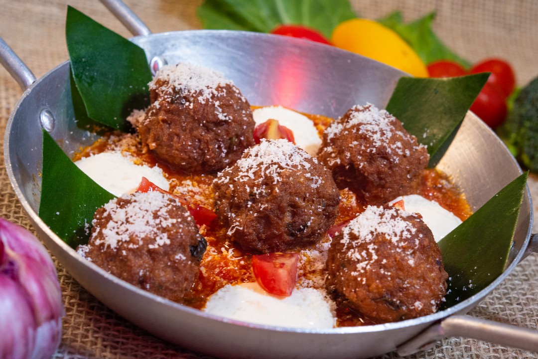 Coxa do pastrami Coxinha de pastrami, à base de um molho ancienne com uma nuvem de queijo parmesão e cebolete.
