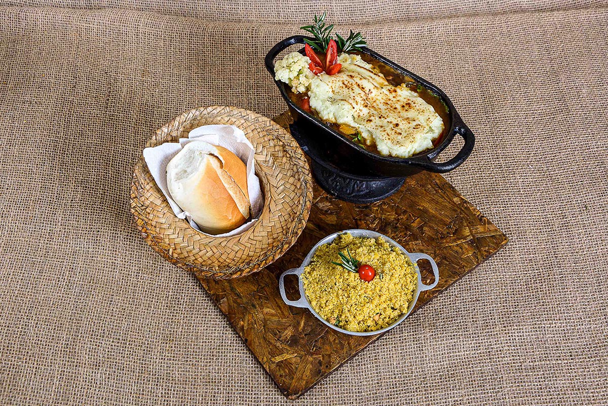 Nuuuu…quebrou minha costelinha! Porpeta de costelinha com bacon assada, recheada com queijo minas, regada ao molho roti, em cama de canjiquinha, acompanhada de quiabo e molho pesto de couve e coentro.