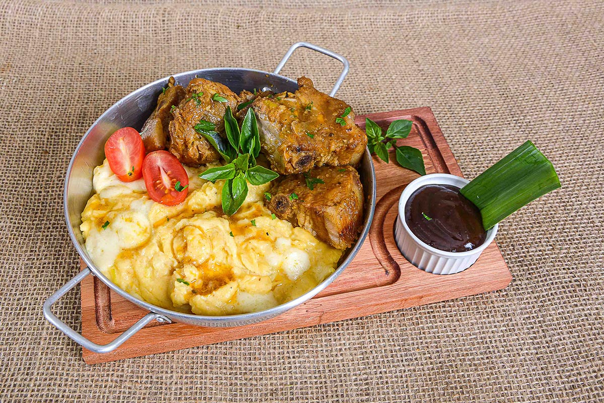 Prata da Casa Sobrecoxa desossada e assada, polenta de milho verde com bacon e queijo e farofinha com quiabo grelhado.
