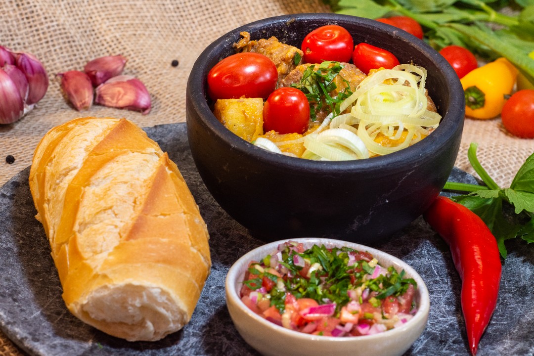 Bacalhau ouro sagrado Bolinho de bacalhau desfiado com massa de batata, salsinha, pimenta-do-reino e azeite. Acompanha um vinagrete de azeitona preta.