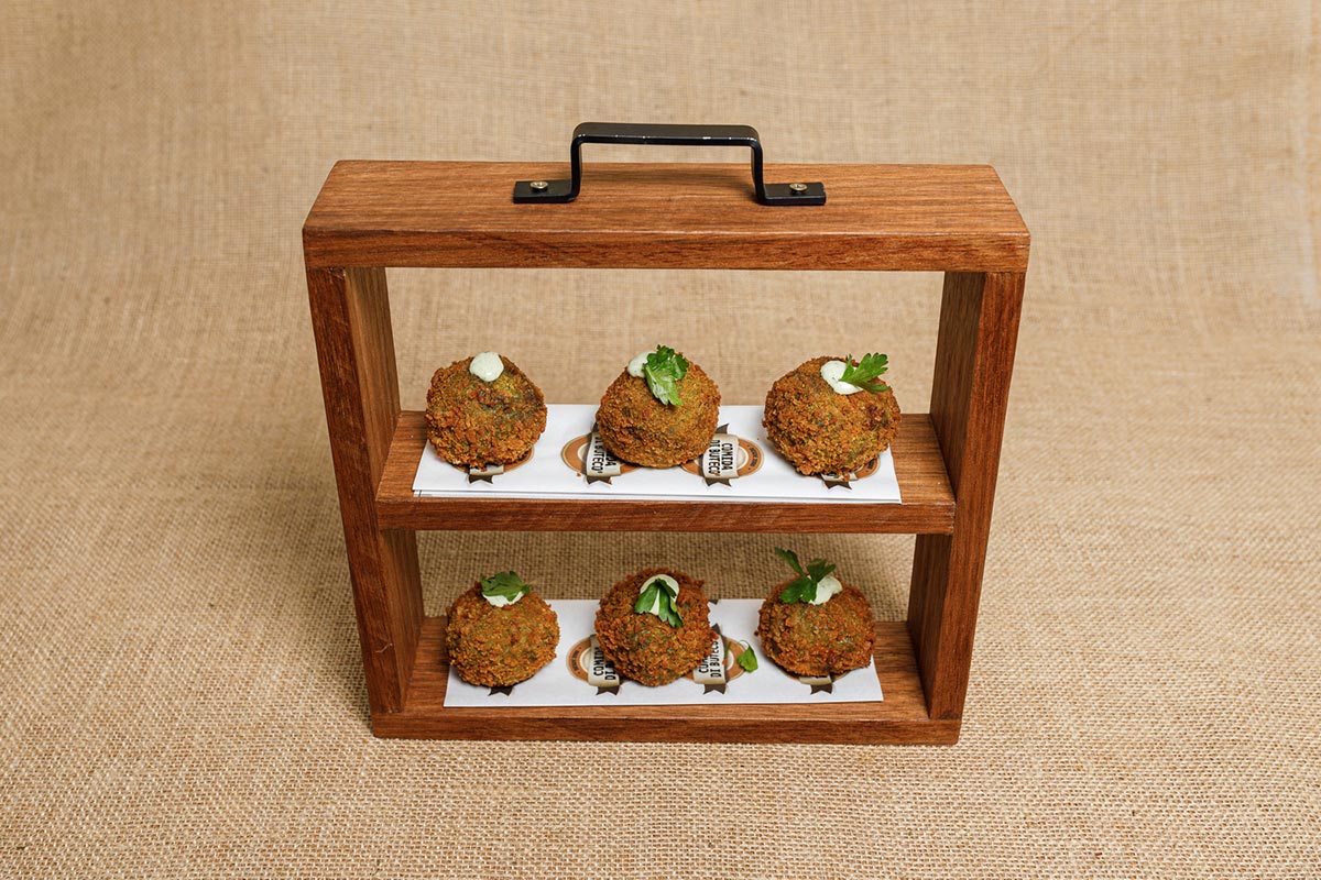 As Aparências Enganam… Jiló recheado com pernil desfiado e, de quebra, miniespetinhos de jiló com queijo e linguiça.