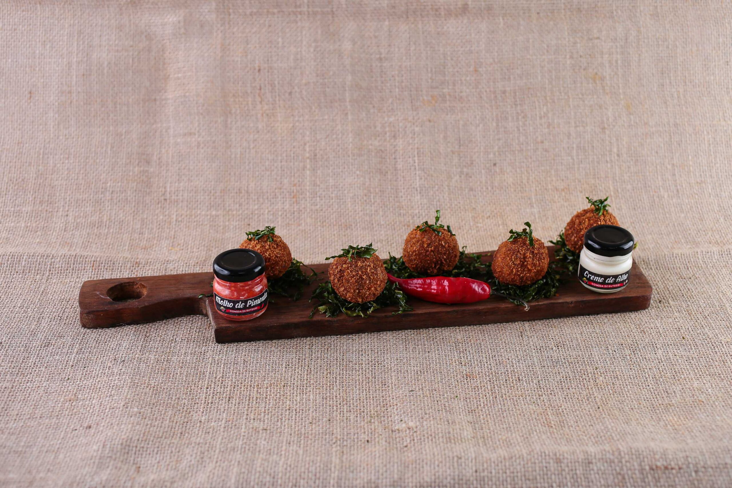 Agarradinho de mignon Cubos de mignon previamente selado na manteiga temperada e espetado no palito com queijo coalho, empanado e frito. Acompanha molhos de alho e de pimenta.