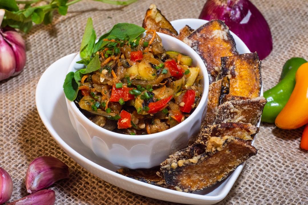 Bombinha de Sabor Bolinho vegano de mandioca com recheio de abobrinha e cenoura. Acompanha molho agridoce apimentado.