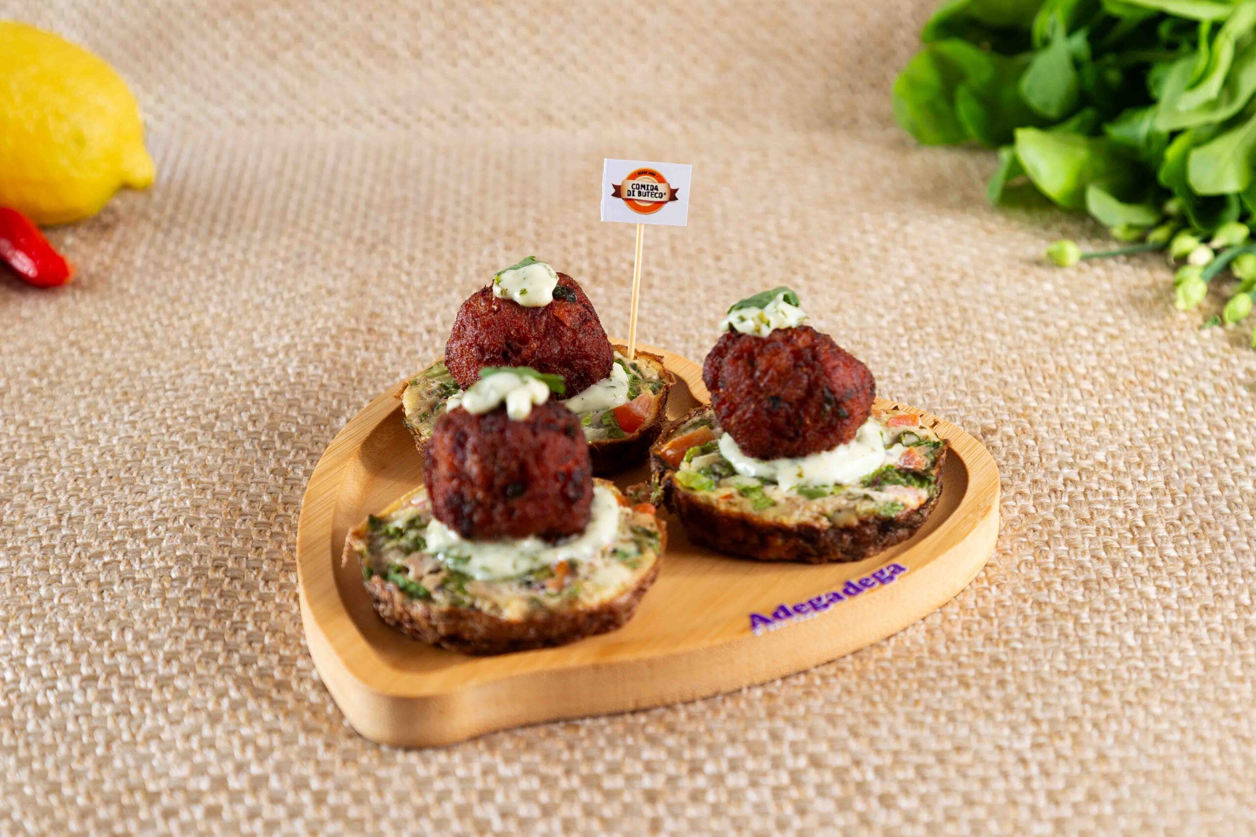 Farra de bacalhau Creme de alho-poró, servido na forminha feita com massa de bolinho de bacalhau Adegadega (cupcake para os aniversários).