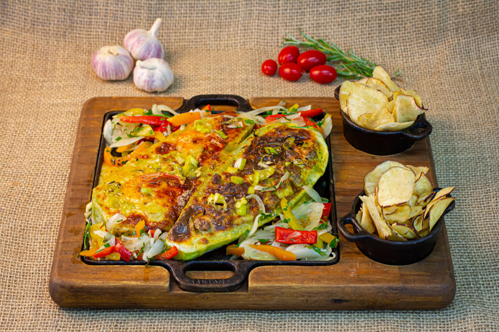 Bife à rolê – Brachola do Andrews Bifes recheados com calabresa, bacon, vagem e cenoura, pré-assados com fino toque de vinho branco ao molho de tomate. Acompanhado de pipoca de queijo coalho e torradas de pão italiano.