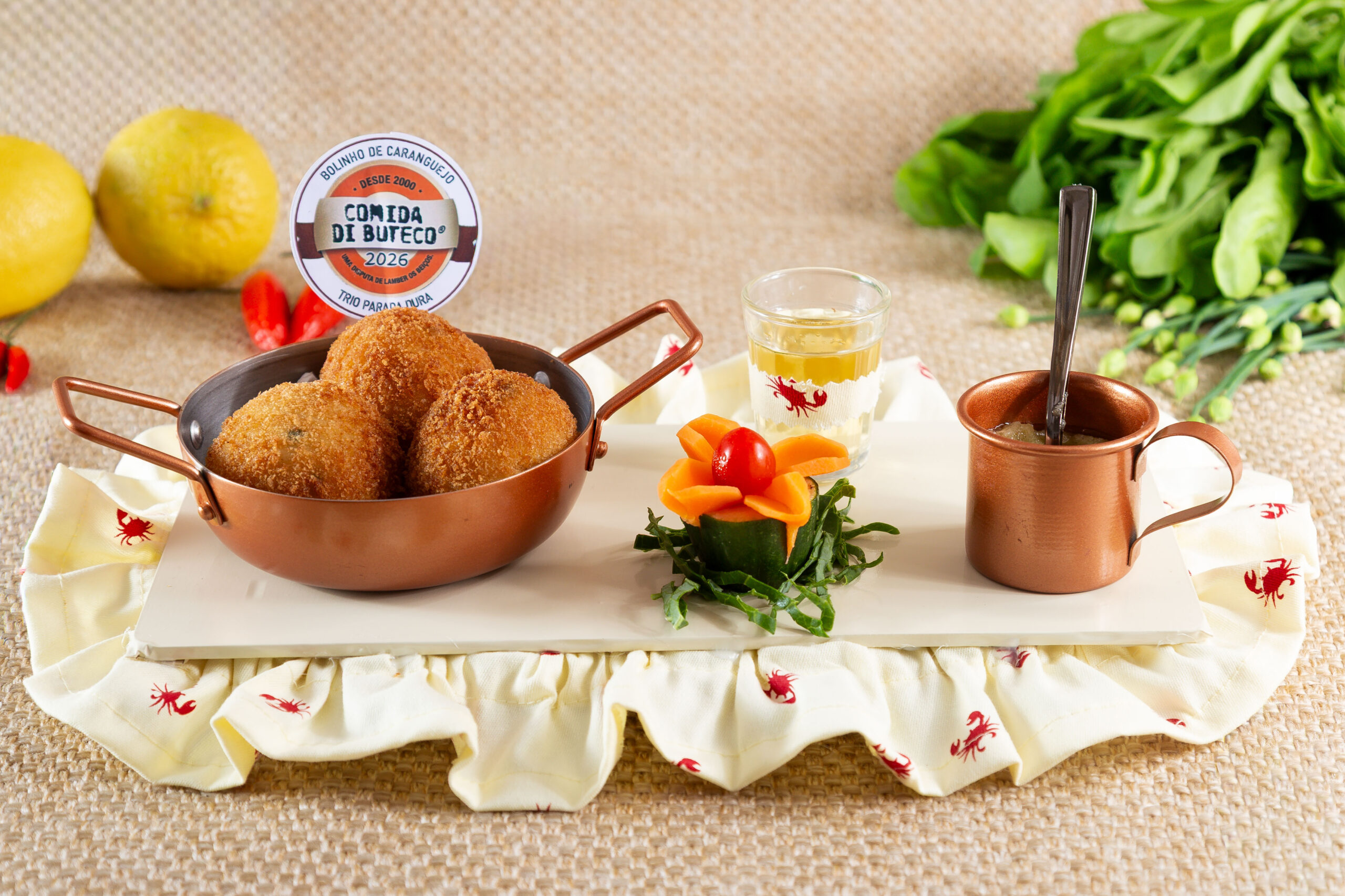 Trio Parada Dura Bolinho de caranguejo, acompanhado por um molho de cebolas frescas com azeite.