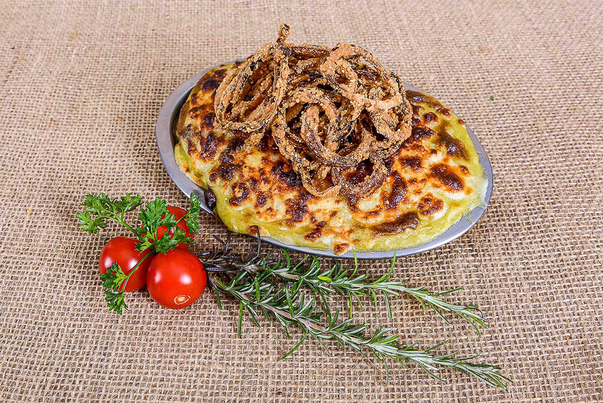 On co tô Moelinha de frango escondida sob purê de alho-poró e crispy de cebola.