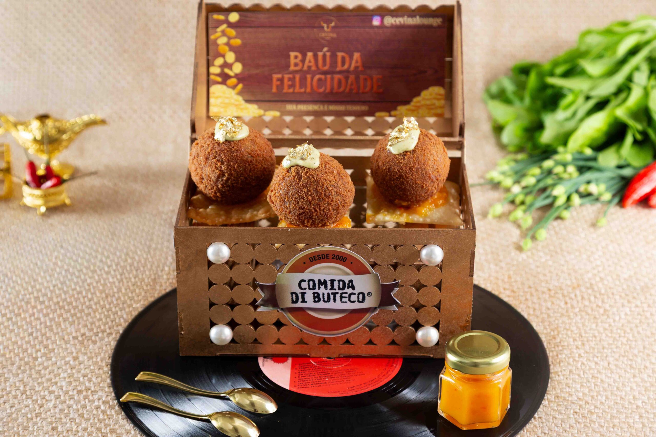 Mãe estou na telinha Croquetes de buteco recheados com pernil, queijo provolone, alho-poró, bacon, empanados na farinha crocante e servidos com geleia de abacaxi com pimenta.