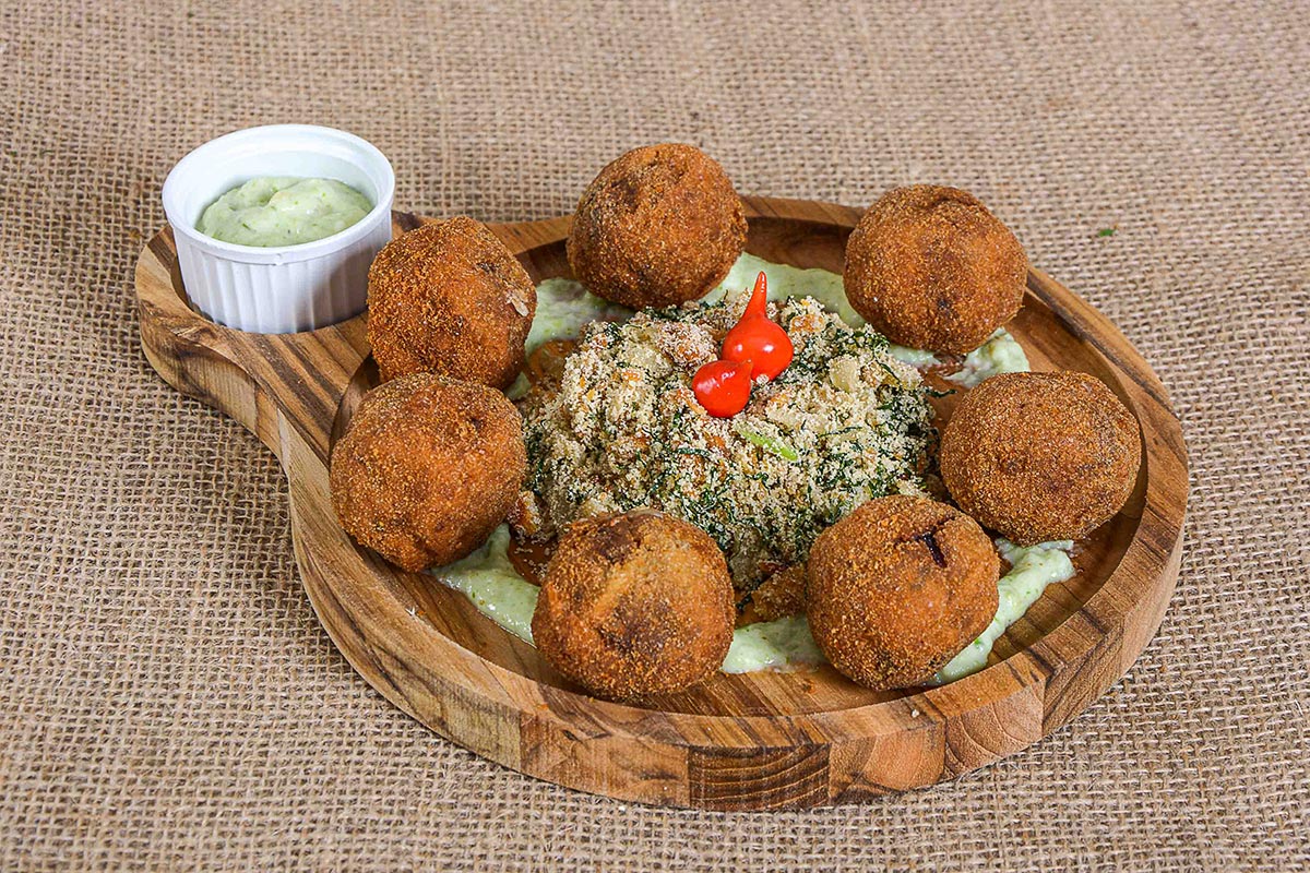 Cadim de Nós Bolinho de carne recheado com alho-poró, requeijão e queijo parmesão, com farofa de couve com torresmo e molho da casa.