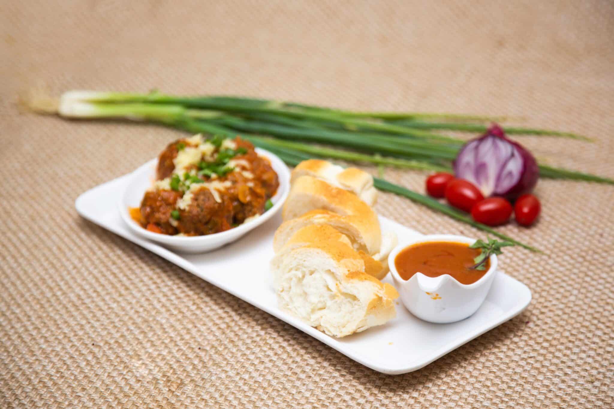 Minialmôndegas recheadas com queijo muçarela, cozidas no molho picante, servidas com fatias de pão.