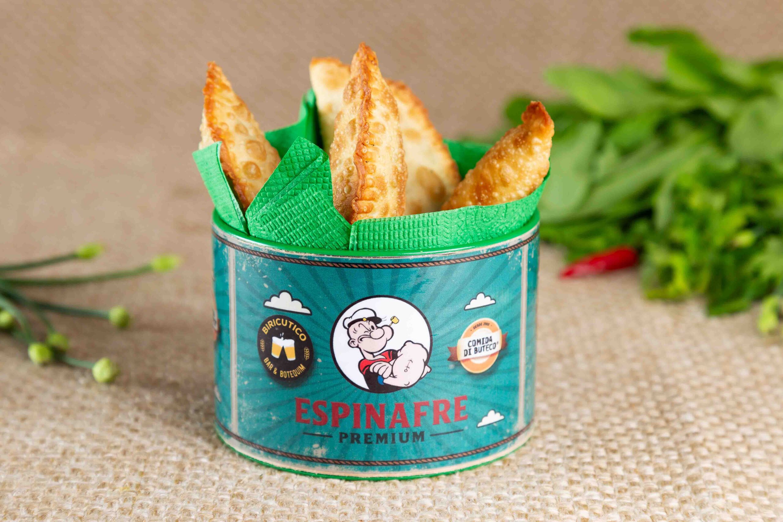 Pastel do Popeye Pastel de espinafre com queijo gorgonzola, catupiry e farofa de torresmo.