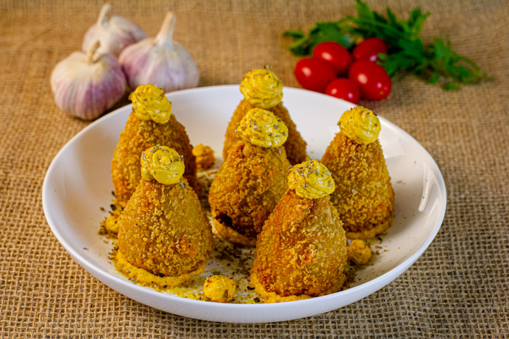 Pão de Pernambuco Pão de queijo recheado com charque acebolada na nata, coberto por uma farofa de queijos (coalho e manteiga), acompanhado de uma calda de rapadura com hortelã.
