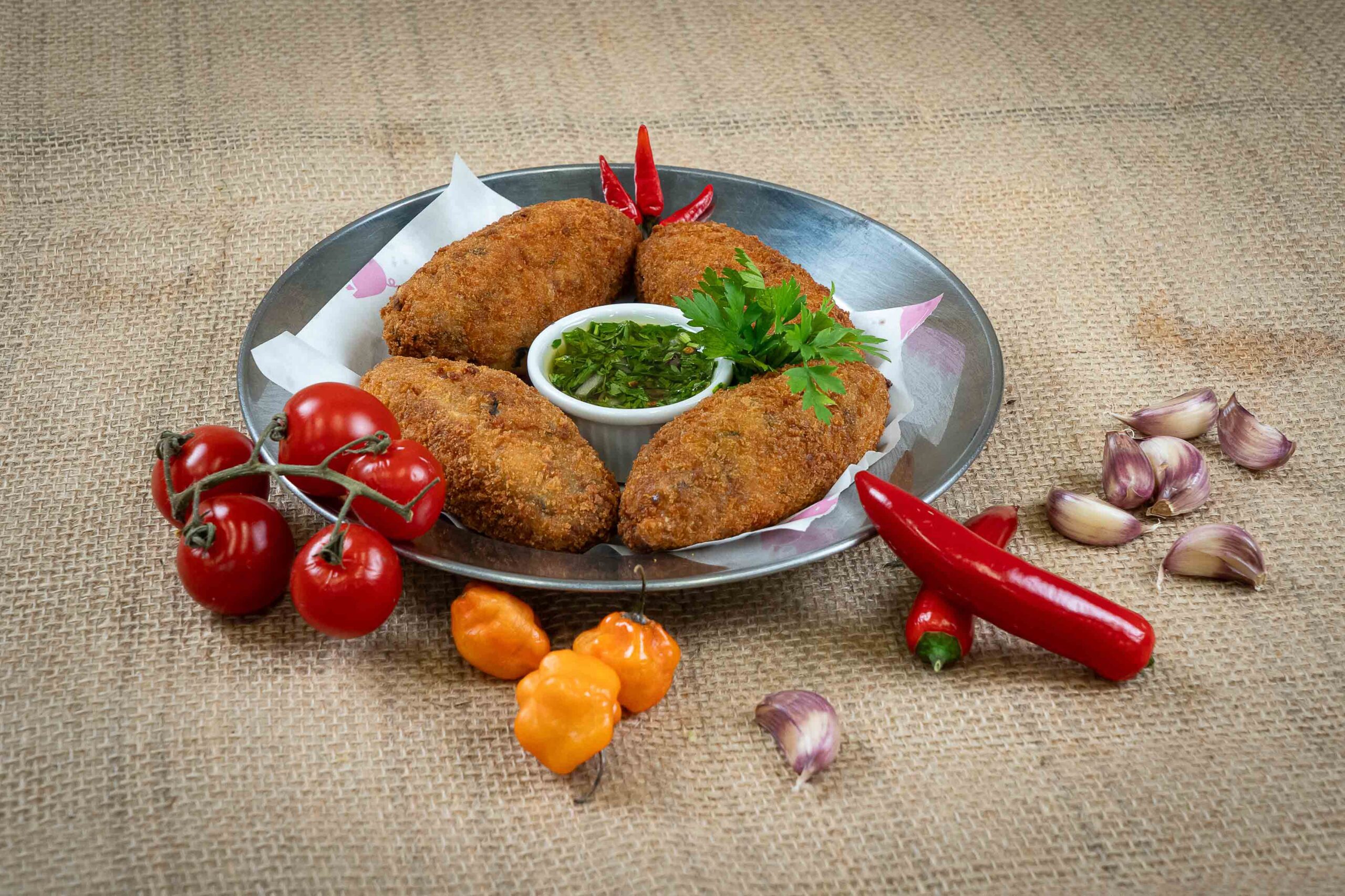 Porco do mato Croquete de porco com espinafre e queijo. Servido com molho chimichurri de ervas finas com pimenta-calabresa.