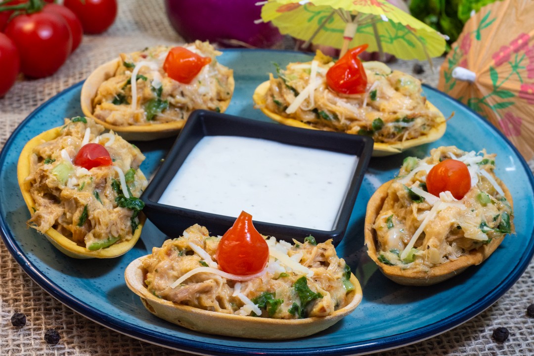 Tá Dando Onda Pernil desfiado com catupiry, rúcula, queijo parmesão em uma barquinha crocante. Acompanha maionese de alho.
