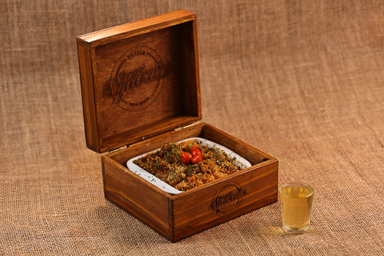 Vou Festejar Iscas de filé grelhadas, com pasta de queijo gorgonzola, sobre uma fatia de pão, com toque de farofa especial da casa. Acompanha 1 copo garotinho de cerveja.