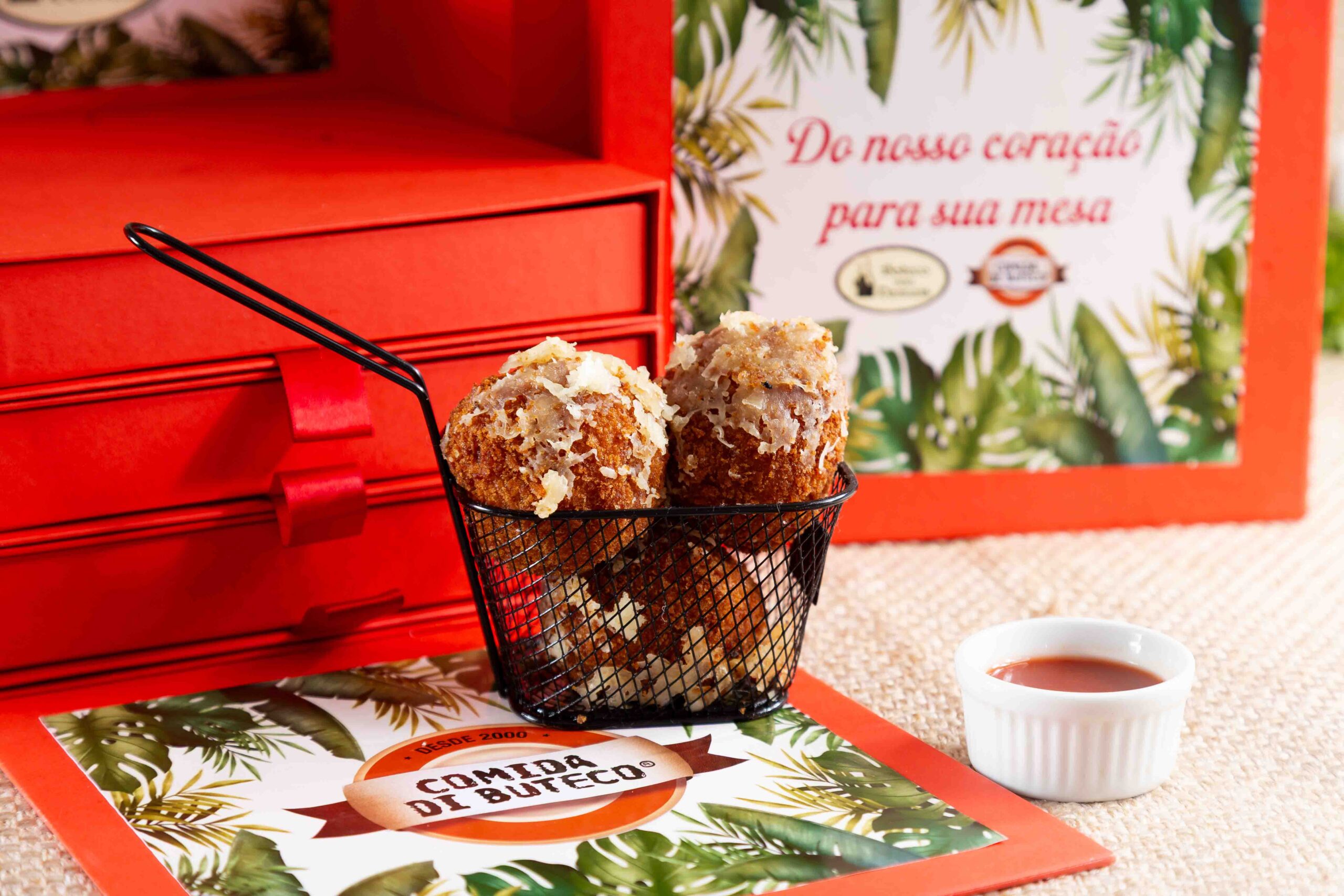 Bananou o Camarão Banana-da-terra cozida, temperada com alho, cebola e recheada com camarão puxado no azeite com alho-poró, pimentões vermelho e amarelo.