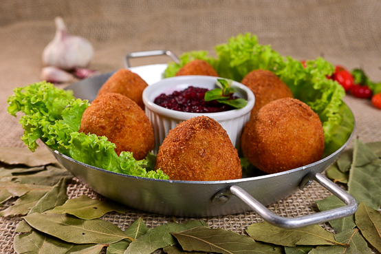 Dercy Gonçalves Bolinho de carne-seca desfiada, misturado com requeijão cremoso e pimenta-biquinho, recheado com muçarela e empanado na farinha panko.