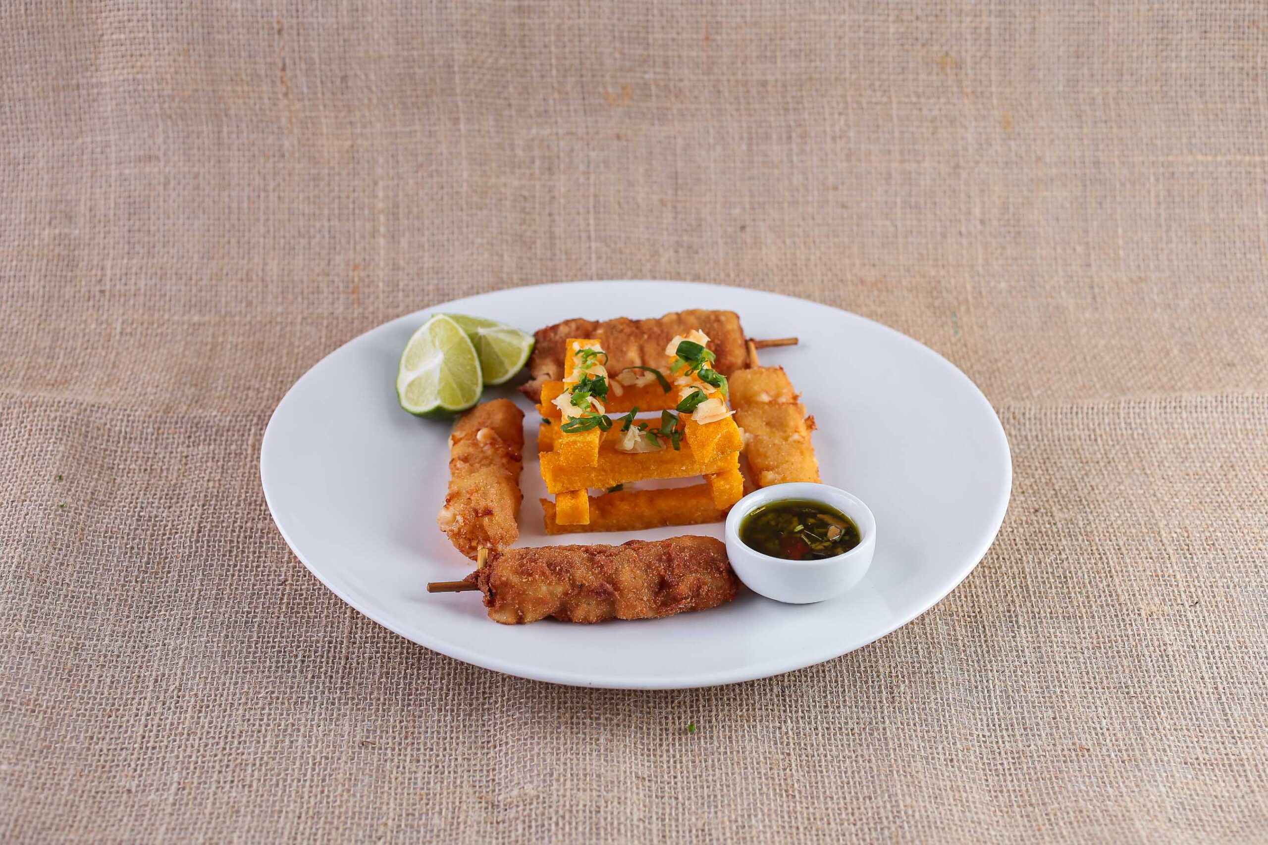 Espetinho de Tilápia Porção de 4 espetinhos de tilápia à milanesa, acompanhados de molho de alcaparras com azeitona.