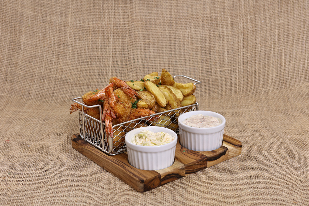 Camarão Crocante Camarões brancos temperados e envoltos no tempurá e panko, acompanhados de batatas rústicas da casa e molhos.