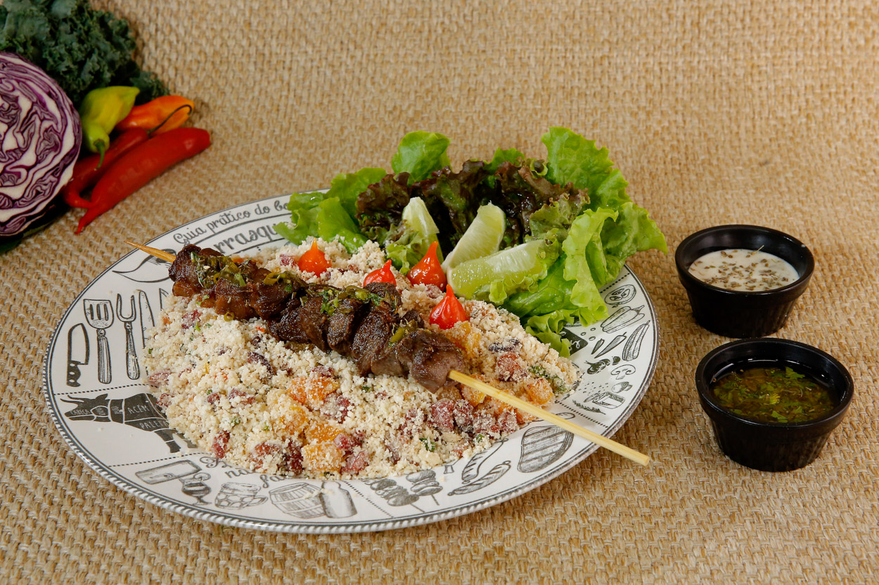 Lamb BBQ com sabor de erva-doce Espeto de cordeiro assado na brasa com molho de ervas doce, acompanhado de uma farofa recheada com bacon, calabresa e damasco.