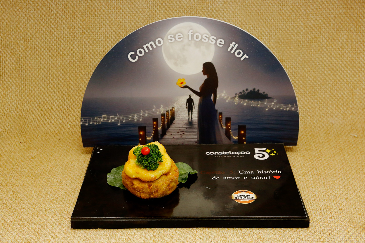 Constelação de Alegrias Chuleta com molho de ervas finas acompanhado de pão de alho.