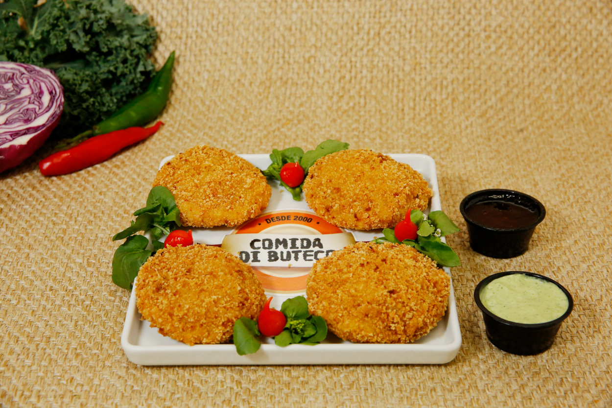 Aipim 2.5 Disco de massa de mandioca, recheado com queijo muçarela, Catupiry e cupim desfiado, servido com molho especial de casa e geleia de pimentão vermelho.
