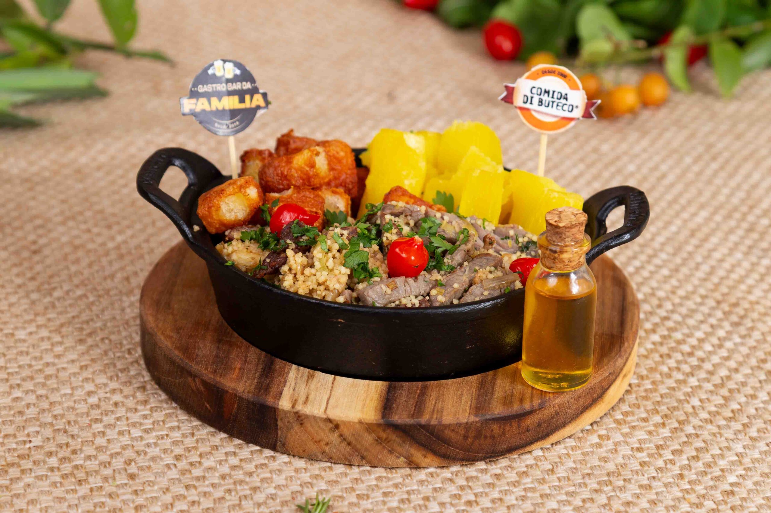 Sanduba de Cria Clássico sanduíche de pernil desfiado, marinado com especiarias e feito na cebola caramelizada. Servido no pão artesanal com manteiga especial e molho à campanha de abacaxi com hortelã apimentado.