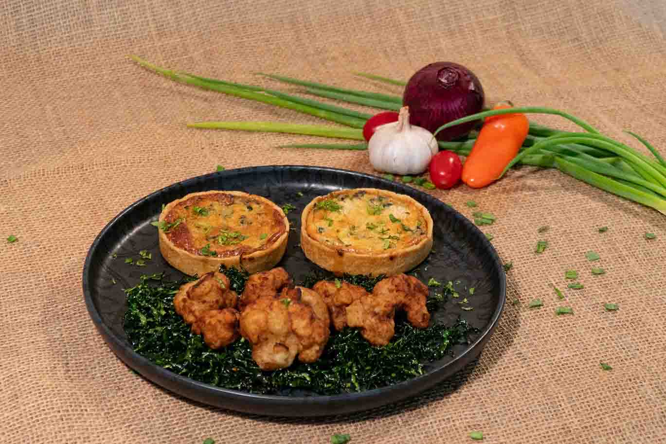Sabores da Terra Quiche de espinafre com queijo parmesão, acompanhado de couve-flor à milanesa e couve crocante (crispy).