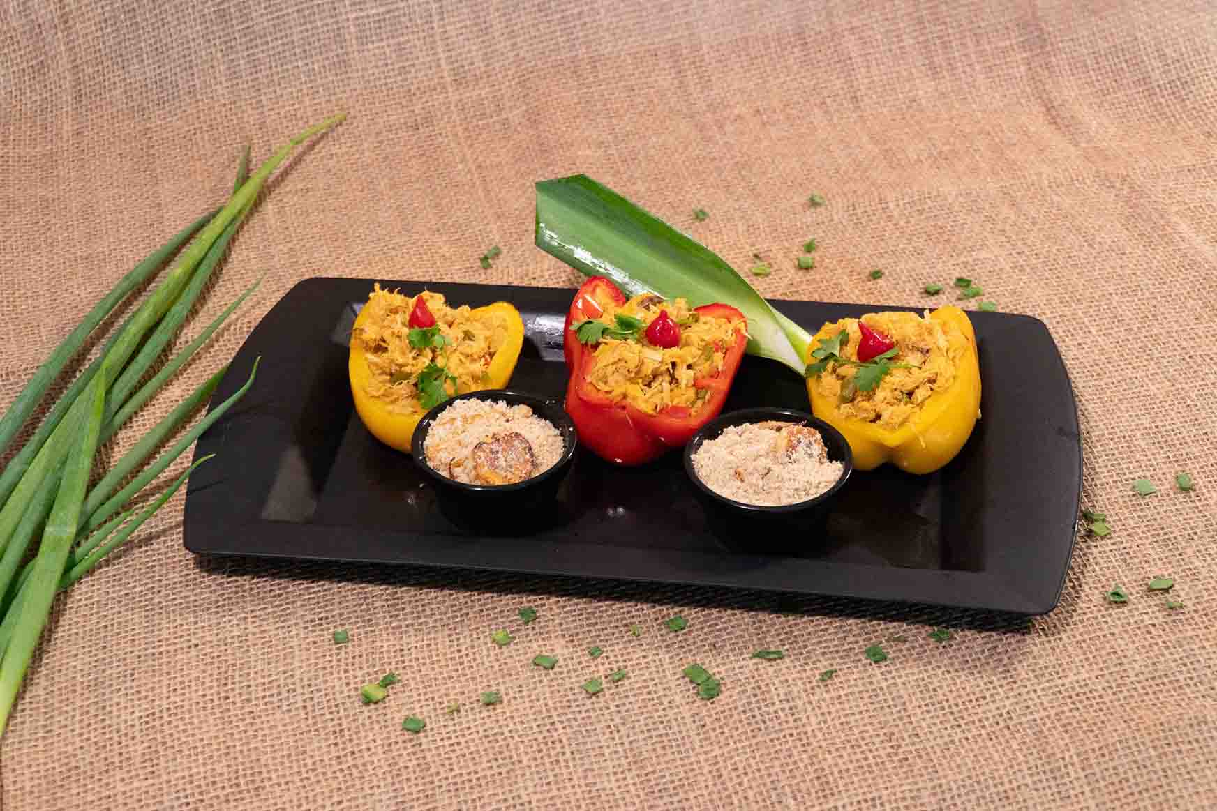 Arraia Tropicana Pimentão recheado de arraia e alho-poró, acompanhado de farofa de banana.