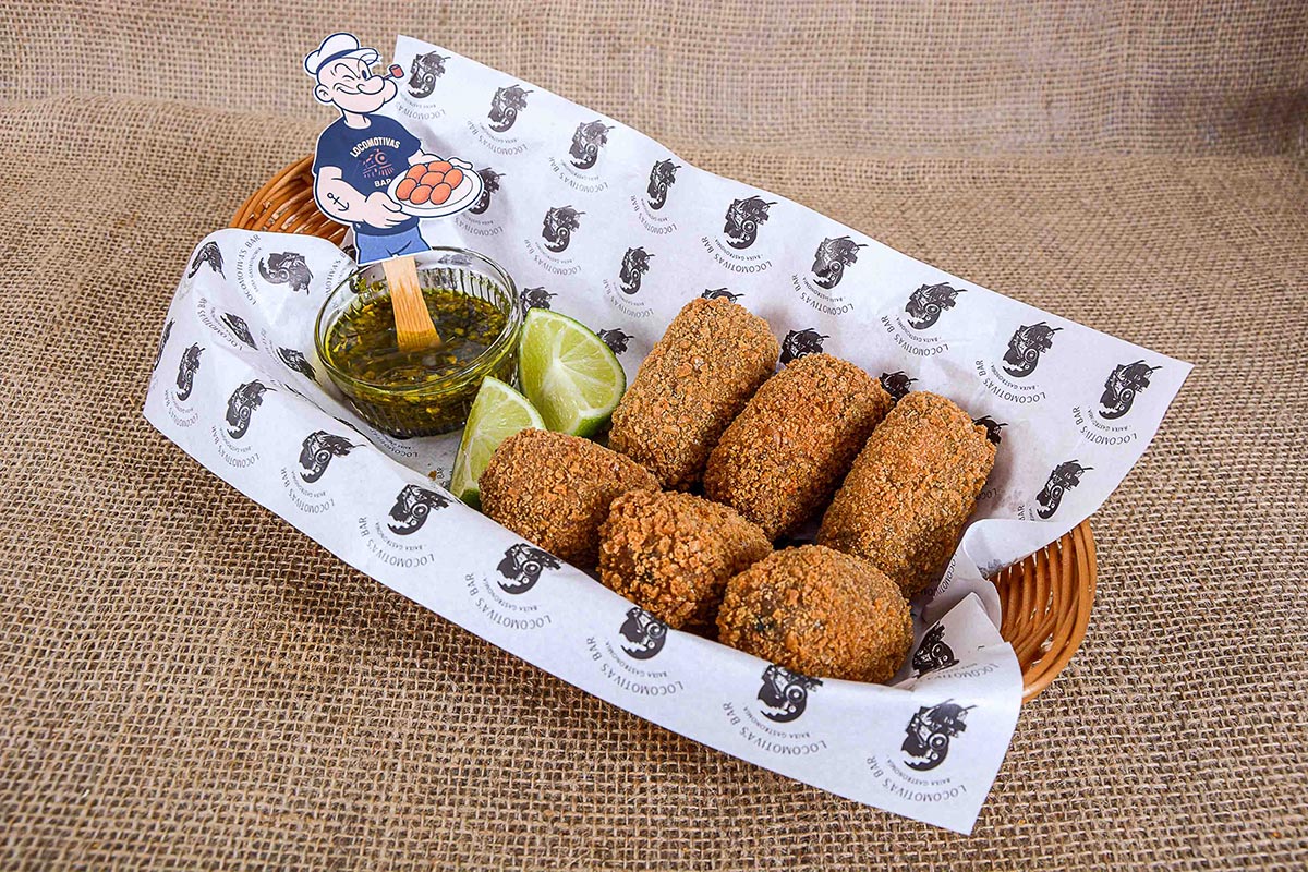 Bolinho misto de costela suína e bacon, recheado com requeijão em barra e acompanhado de geleia de abacaxi com gengibre.