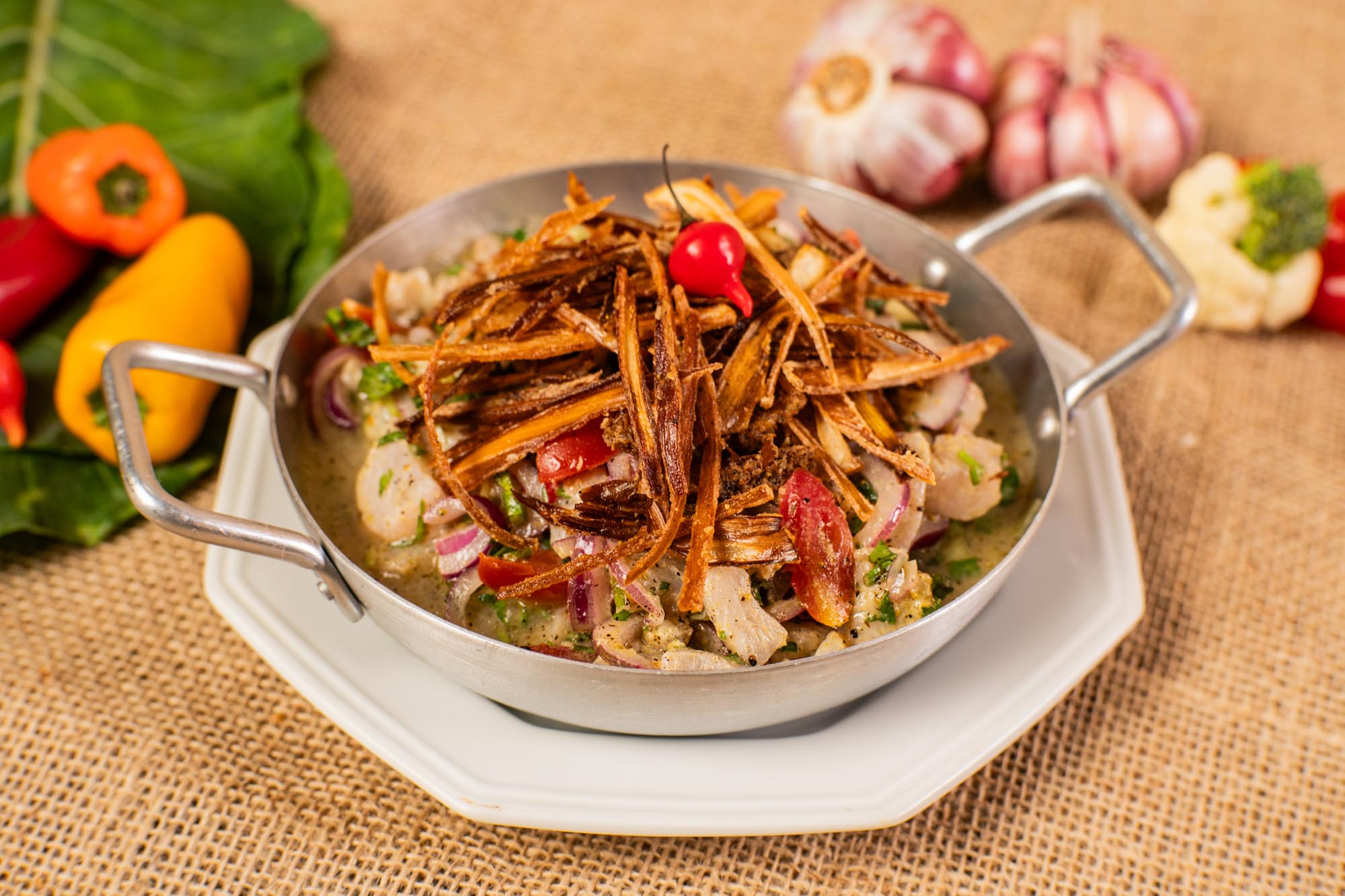 Ceviche com crispy de alho-poró Ceviche de tilápia com crispy de alho-poró.