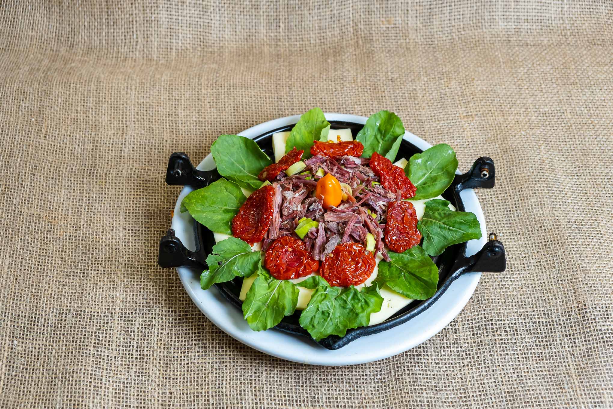 Todo derretido Charque desfiada com alho-poró, rúcula, queijo coalho e tomate seco na chapa.