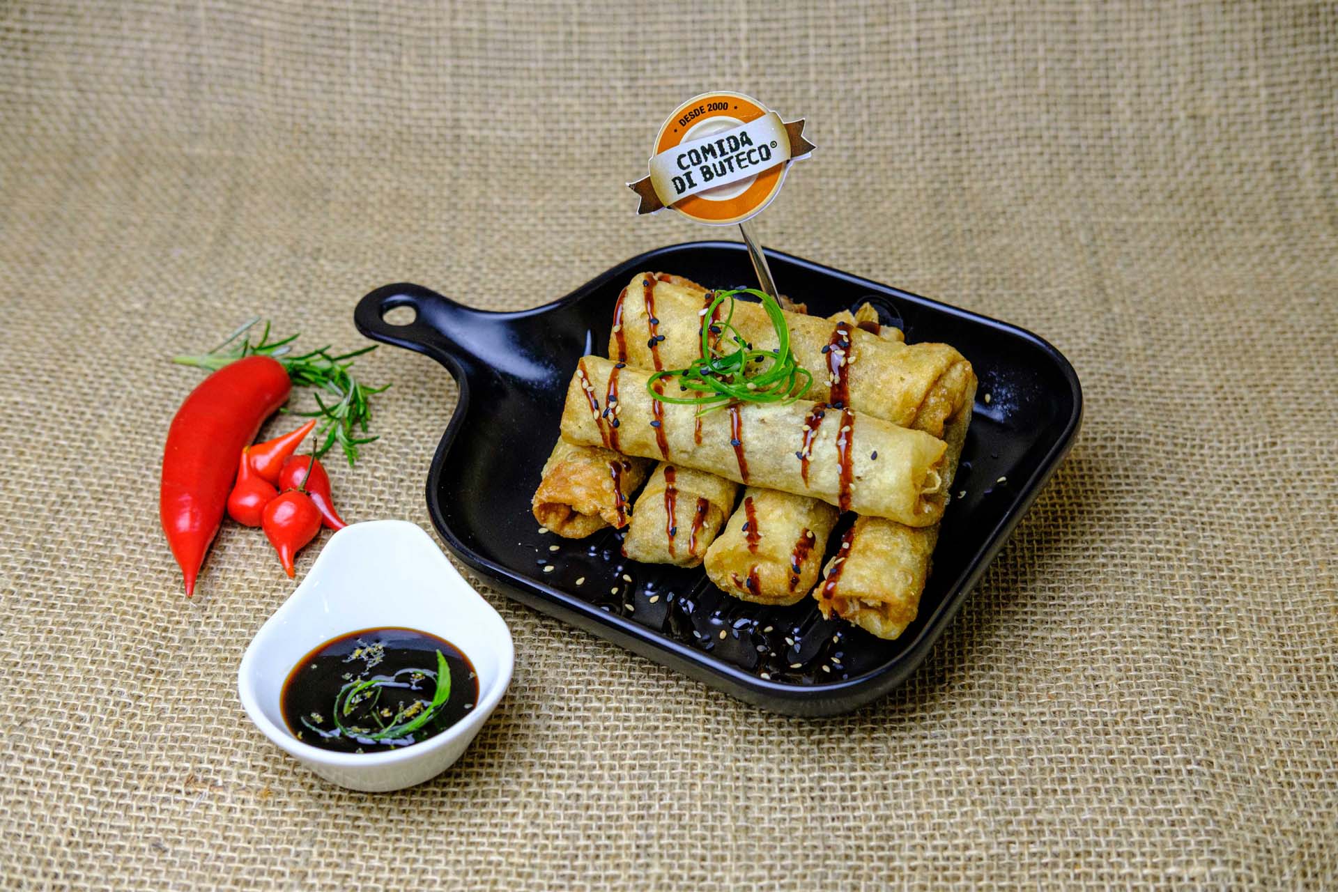 Harumar Rolinhos de massa crocante recheados com repolho, cenoura, gengibre e ostras. Acompanhados de molho teryaki e geleia de pimenta.