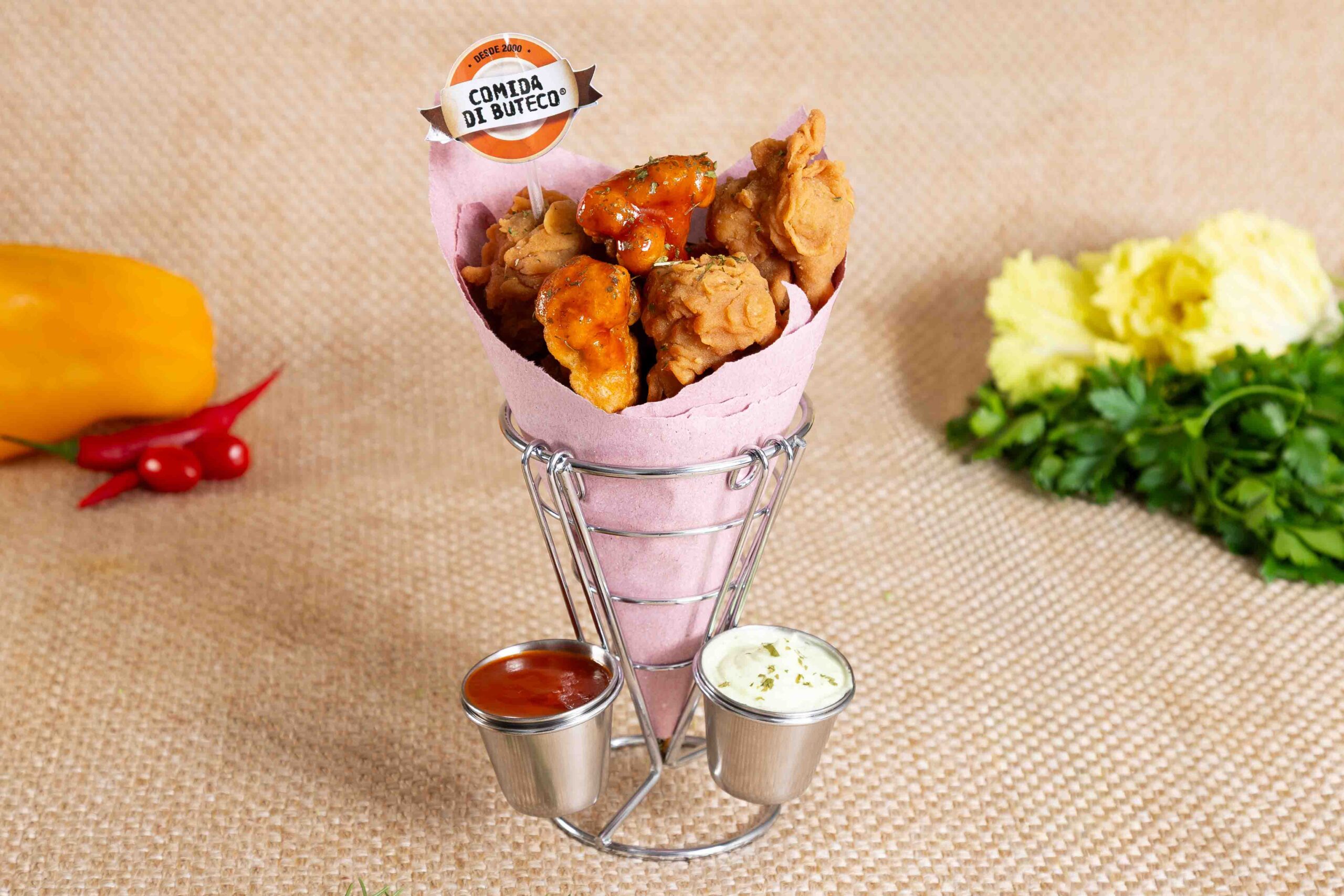 Caldinho e Bochecha na Cumbuquinha Mix de carnes bovinas desfiadas, triângulos de milho frito com parmesão, crispy de alho-poró, aioli de limão-siciliano acompanhada de caldinho de tomate picante.