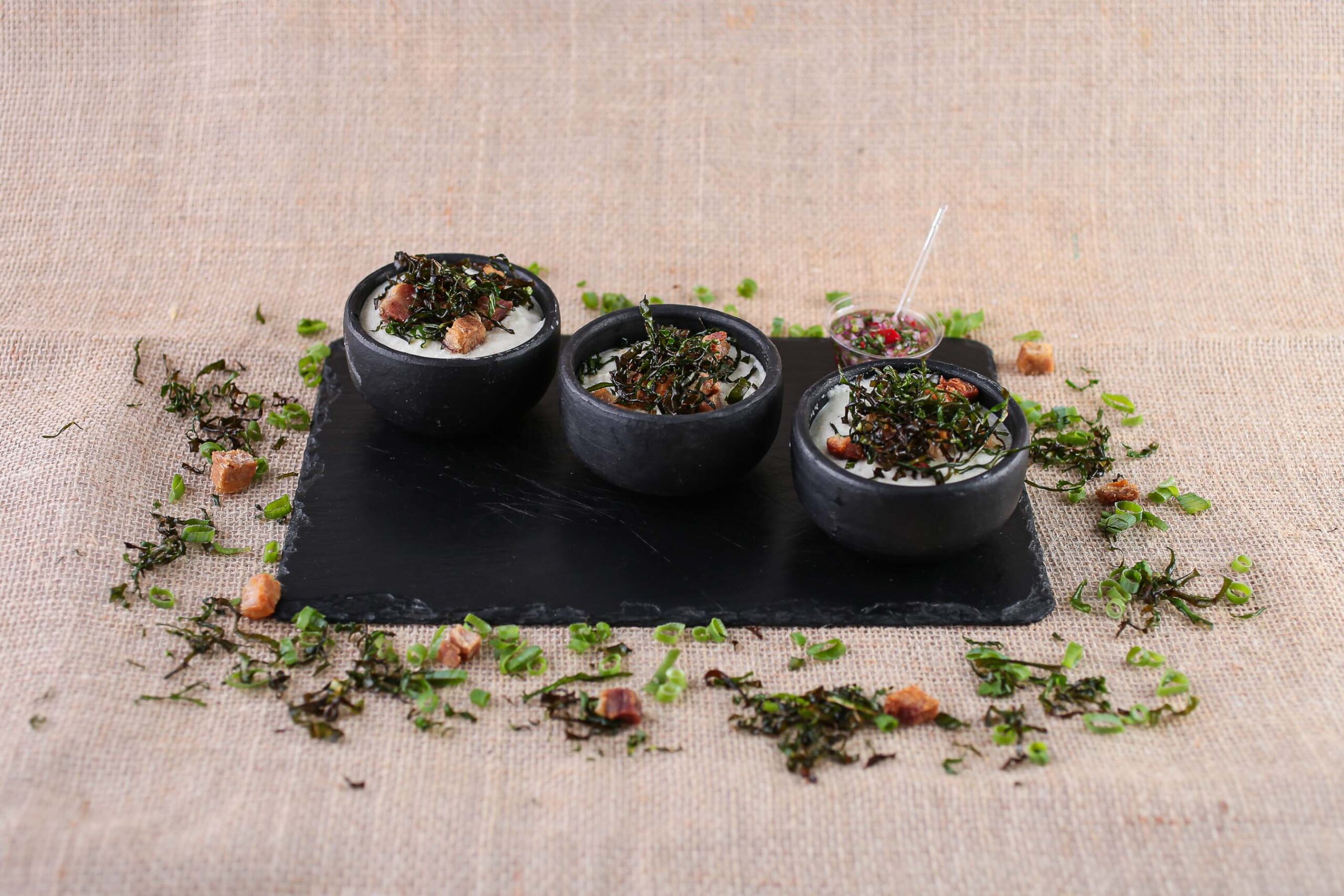 Colher armadilha Purê cremoso de couve-flor com pedaços crocantes e dourados de torresmo, temperado com especiarias. Acompanha crispy de couve-manteiga e vinagrete da casa.