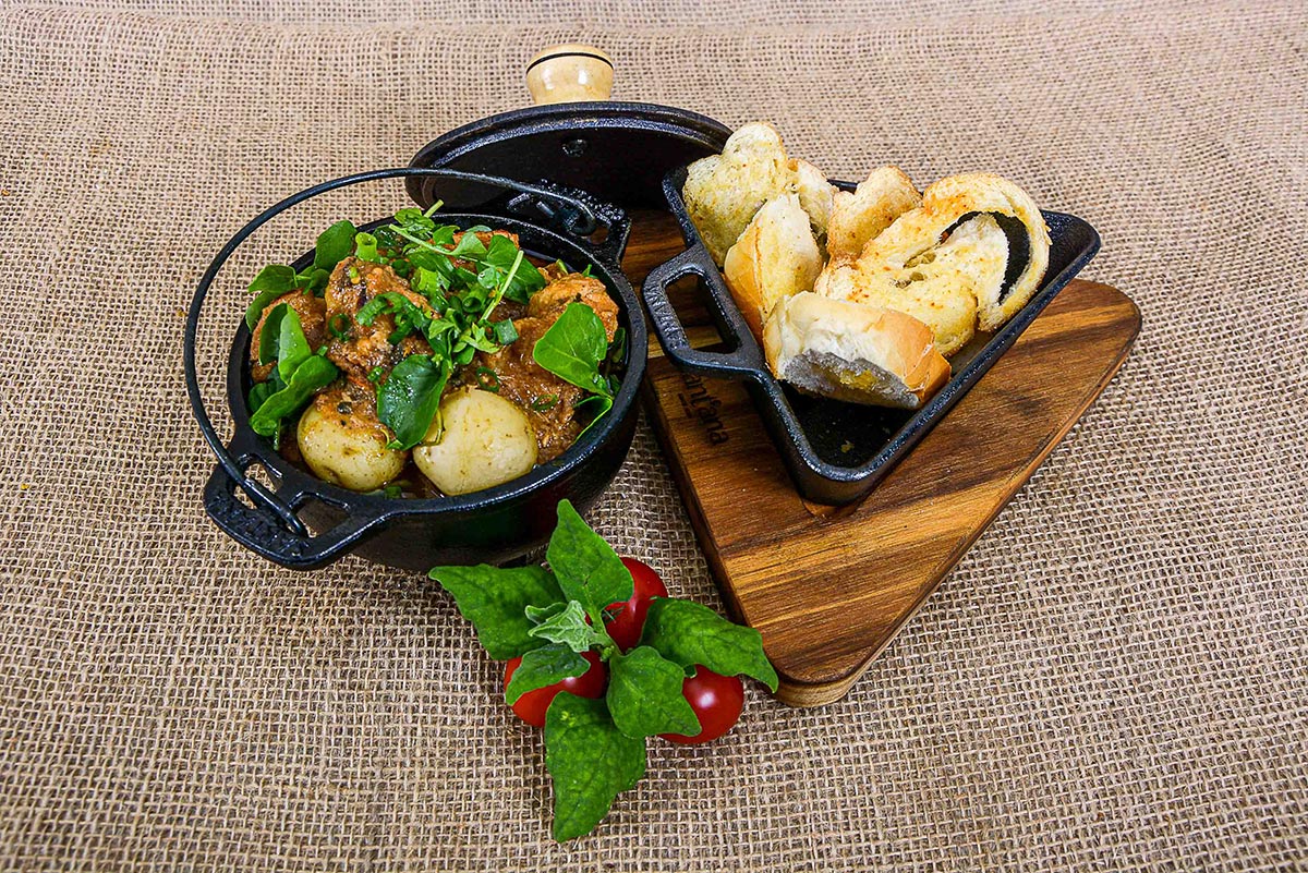 Costela de Adão Costelinha de porco assada, finalizada com molho barbecue e guarnecida em cama de farofa crocante, acompanhada de uma maçã caramelizada.