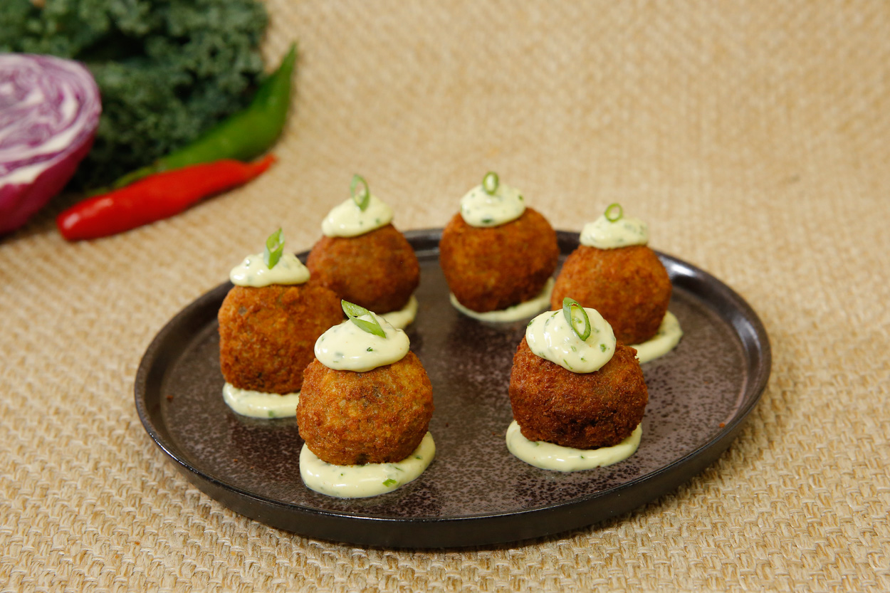 Chica doida Panelinhas de creme de milho com frango, carne e linguiça, coberto com uma espuma de queijo e acompanhado com caviar de Pequi .