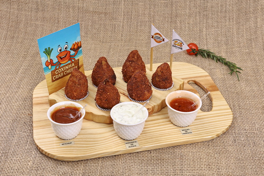 Crab Cheese Coxinha de carne de siri com molho de maionese de alface, molho de ketchup e molho de pimenta agridoce.