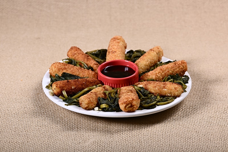 Rolinho Paidegua de Pirarucu Rolinho de repolho recheado com pirarucu ao molho de tucupi reduzido com jambu e banana-da-terra.