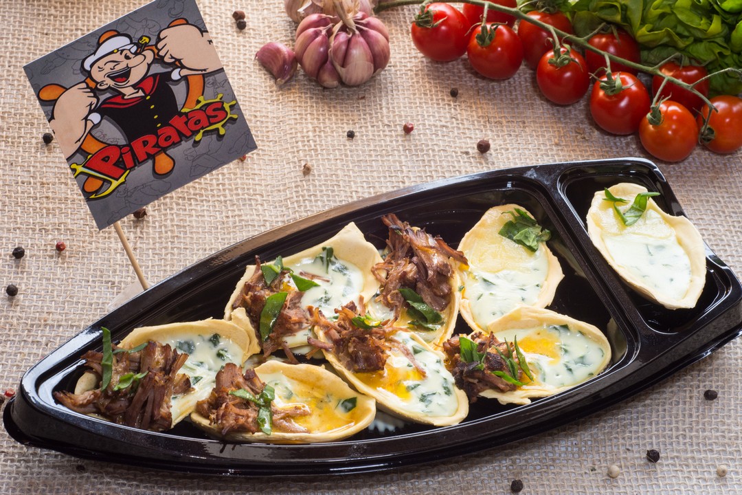 Segredo do Popeye Canapé com base de espinafre cremosa, sendo 3 unidades de queijo muçarela derretido e 5 unidades de ponta de agulha desfiada e demi glace.