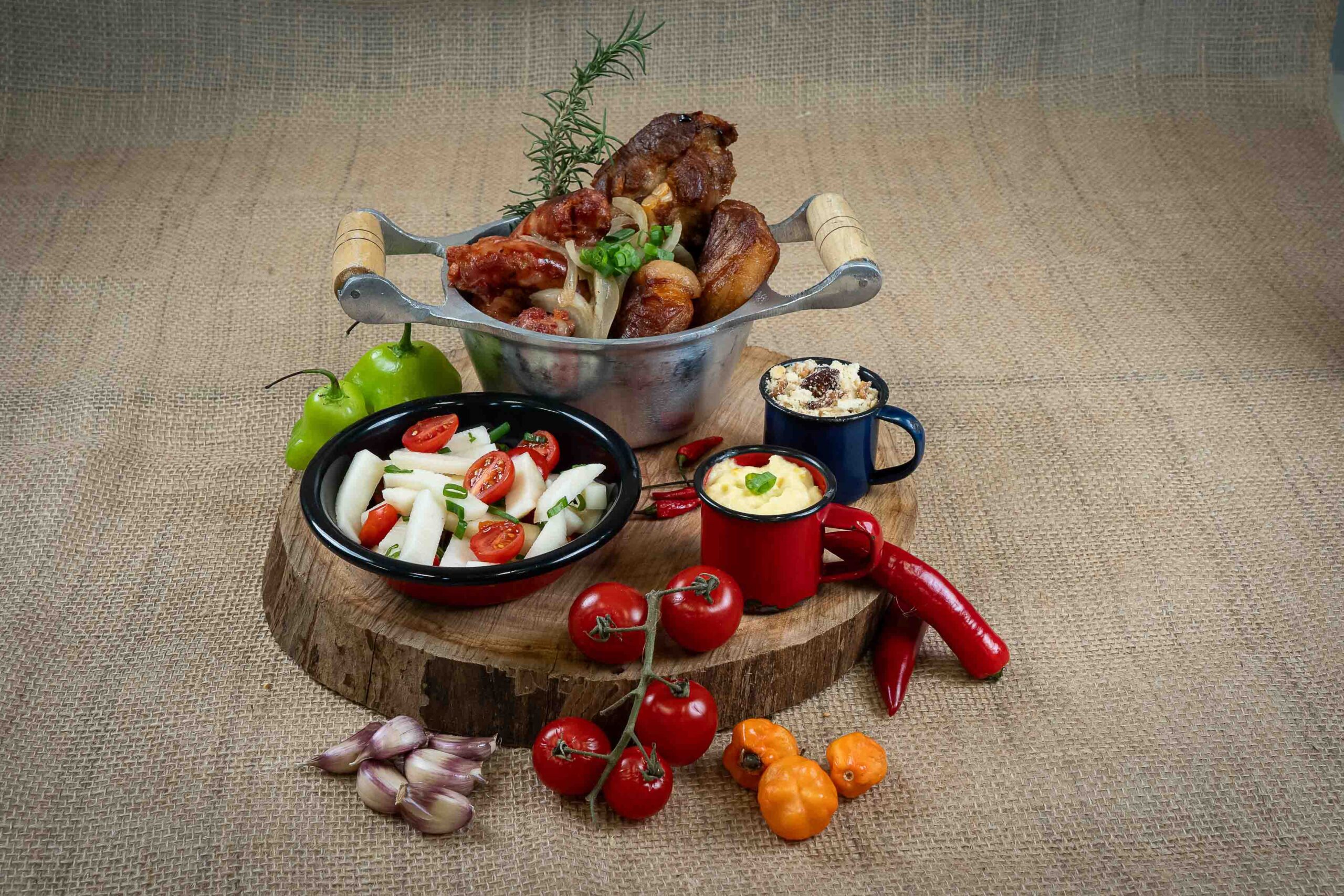 Tesouro da Lata Trio de carnes de lata (pernil, linguiça e costelinha), acompanhado por broto de bambu, farofa de torresmo e creme de milho.