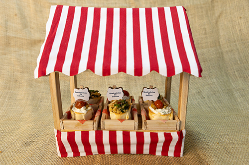 Quadradinho de sabores Quadradinhos de massa de pastel: três recheados com ricota e espinafre, decorados com tomate-cereja, e três com pernil suíno desfiado, acompanhados de chimichurri.
