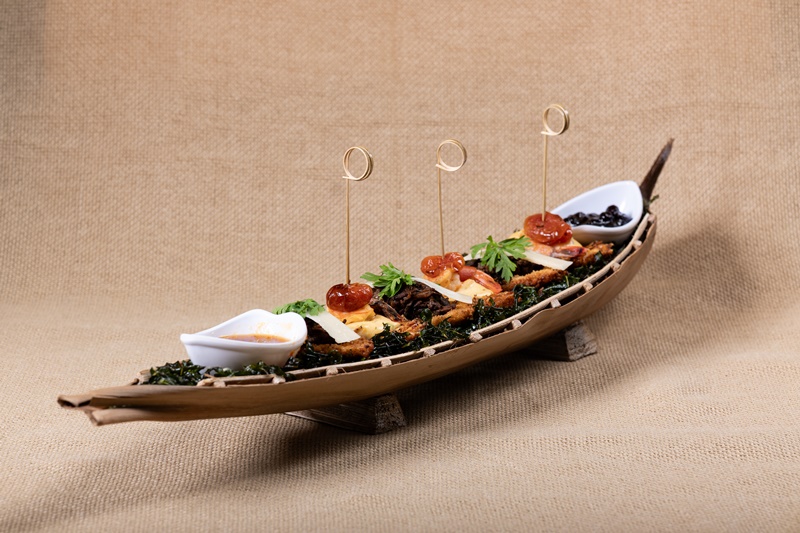 O barco Duo barquete de abóbora e batata empanada com áviu. Recheado com patê de camarão rosa e camarão regional com cream cheese e ricota e tomate sweet confit. Barquete de abóbora com batata, empanada com farinha panko da casa, recheada com cupim assado de forno e desfiado, funghi desidratado e queijo coalho gratinado.