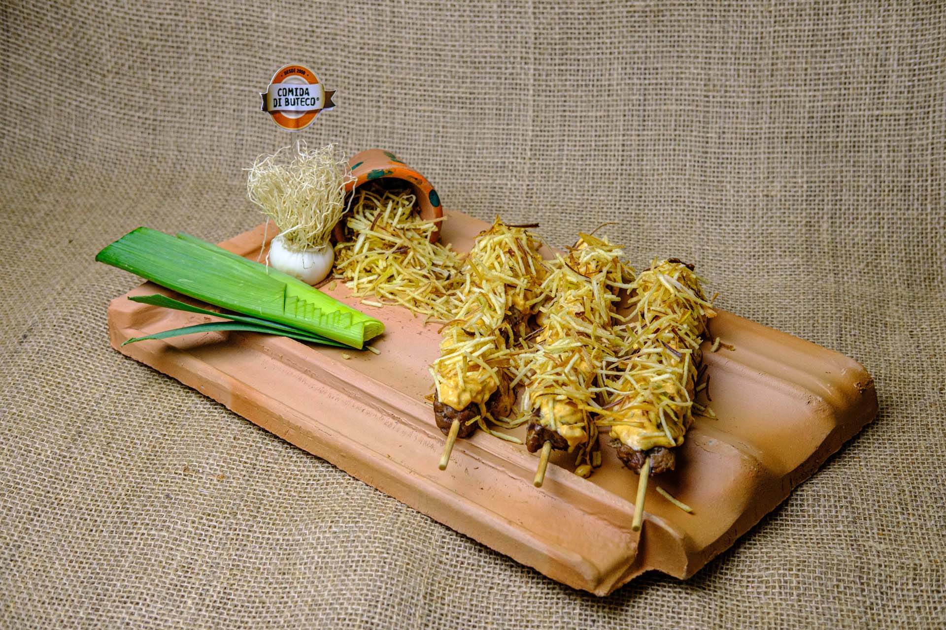 Porco Maluco Carne de porco enrolada no bacon, com cebolas, pimentões e calabresa.