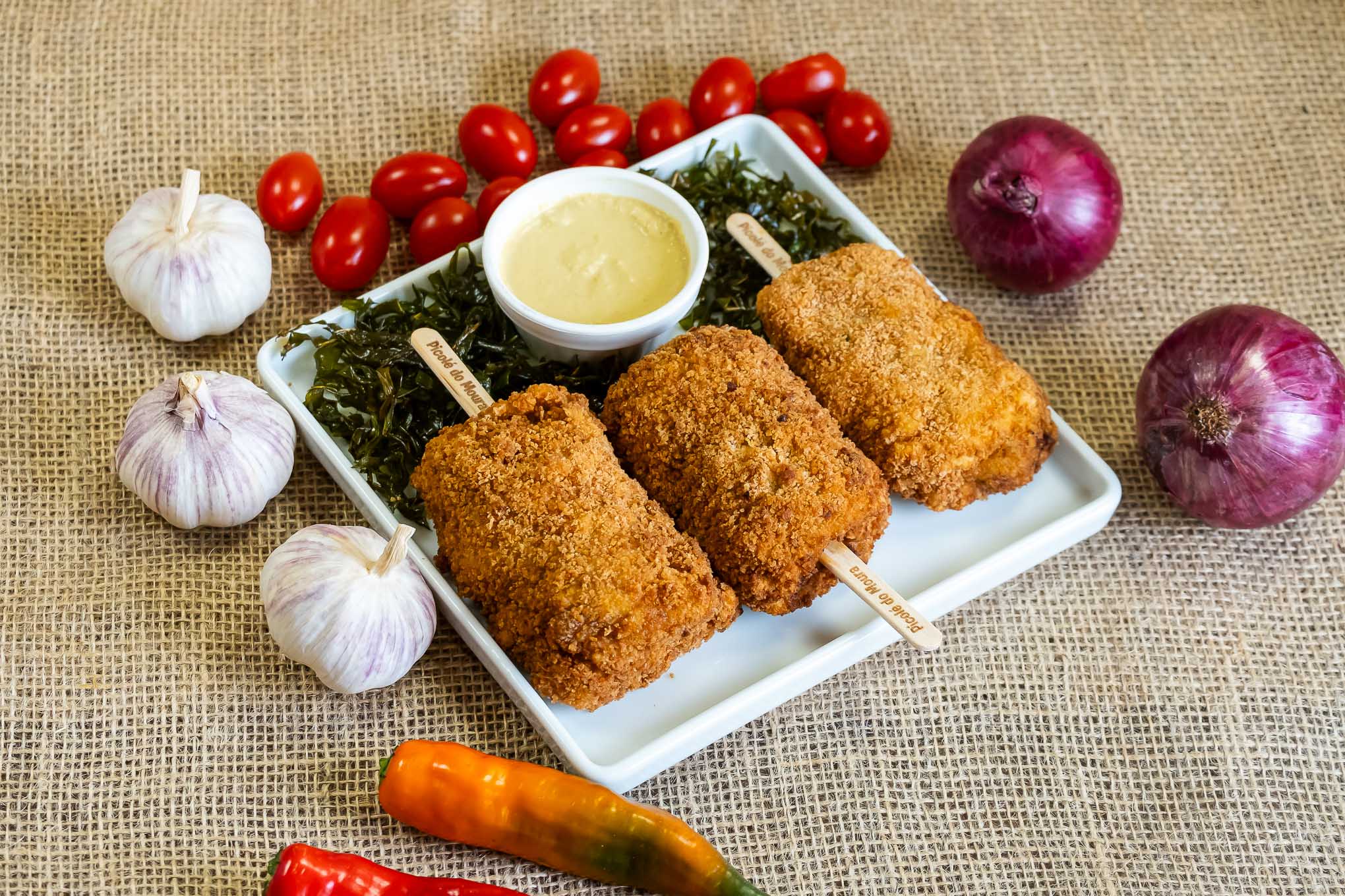 Hora da festa Costela bovina na chapa, acompanhada com pirão de batata-doce, pirão de aipim, legumes e um molho à moda da casa.