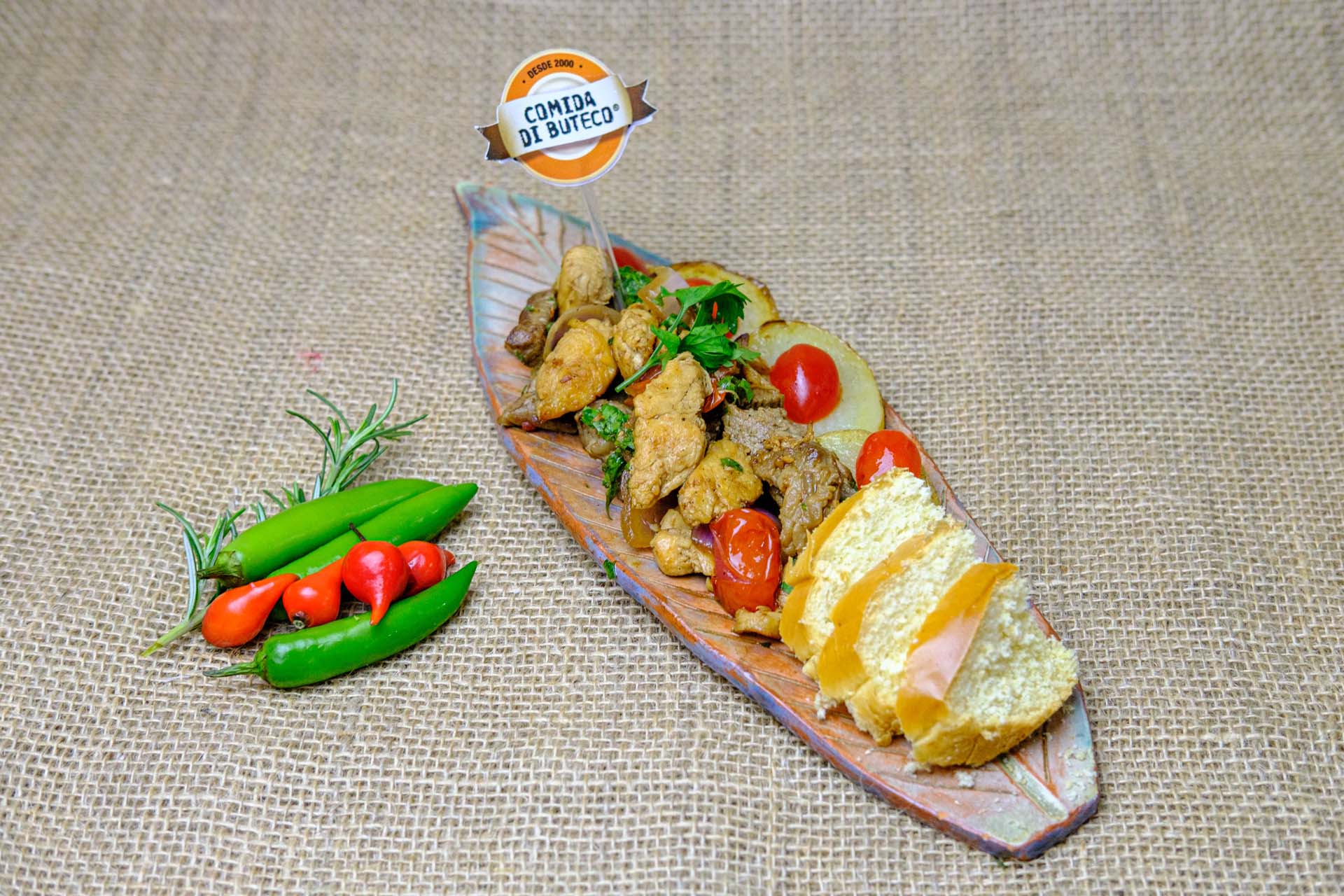 La Plancha Salteado de carne de gado e frango com cebola-roxa, tomate-cereja e brócolis.