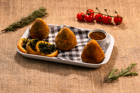 Deixa falar Bolinhos de carne de língua desfiada com queijo parmesão. Acompanha geleia caseira de abacaxi com pimenta.