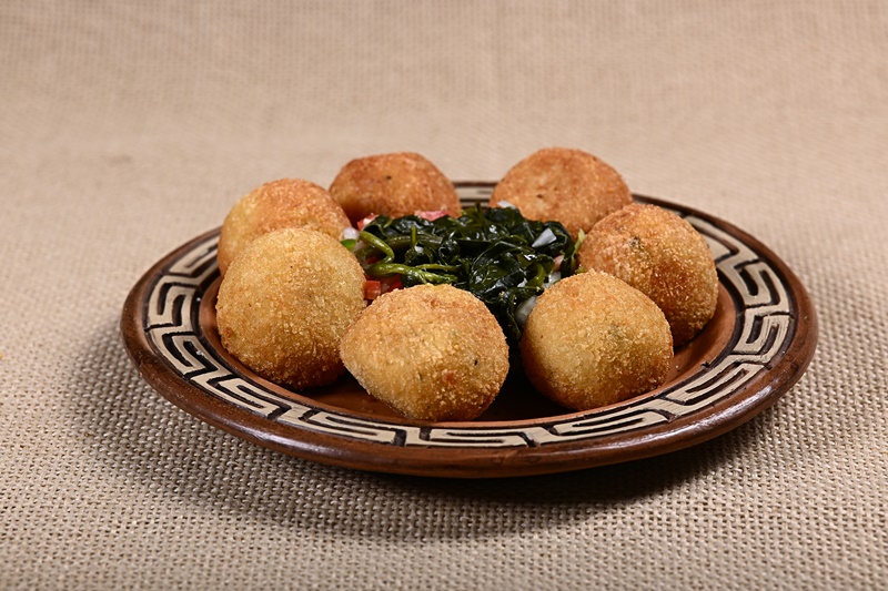 Bolinho de gurijuba salgado de vigia Bolinhos feitos com massa de batata com peixe gurijuba desfiado e frito, com acompanhamento de jambu ao tucupi e vinagrete de tomate, cebola, cheiro-verde e pimenta-de-cheiro.