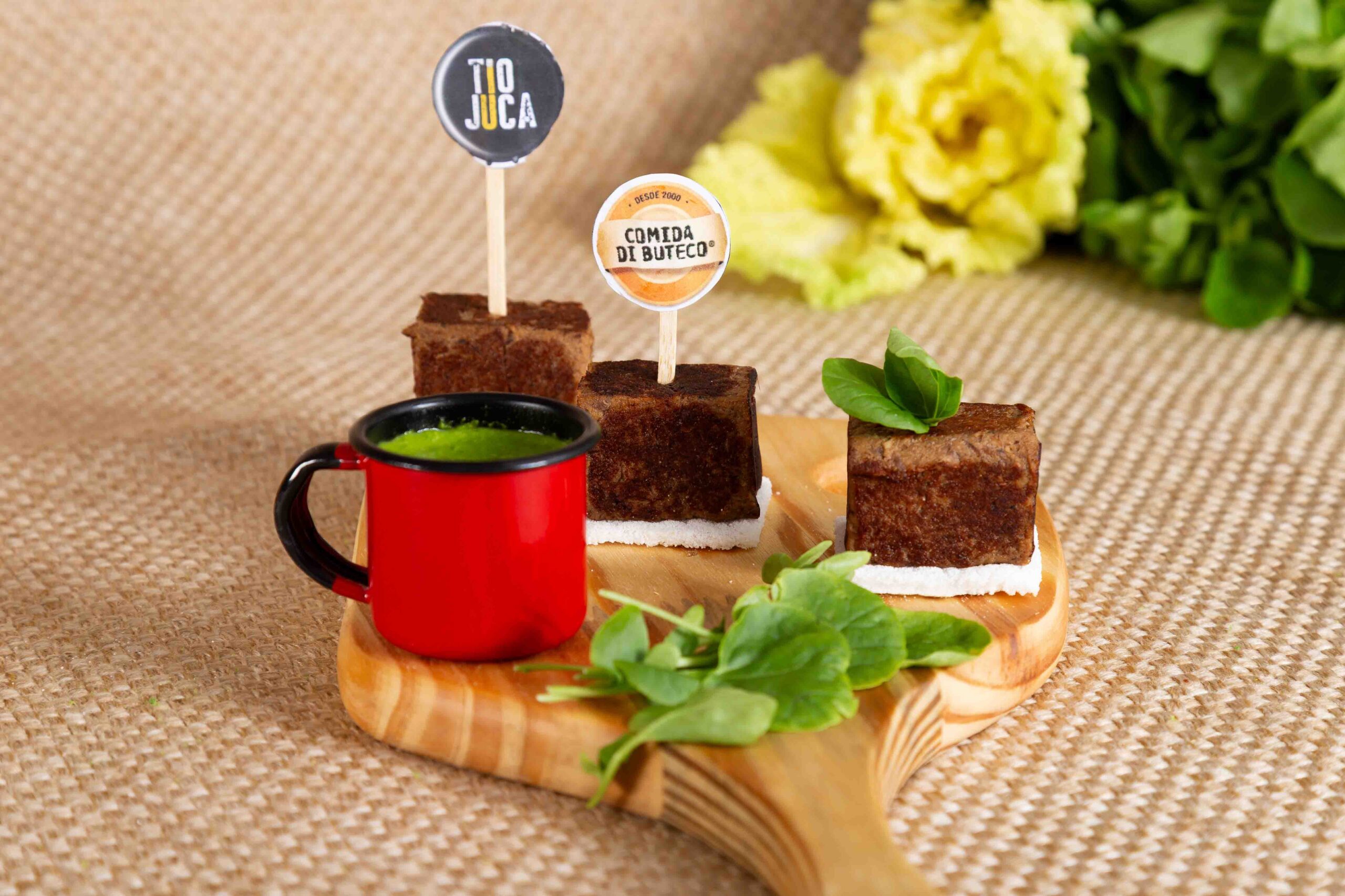 Fui prensada e gostei! Costela bovina de longa cocção, prensada, dourada na chapa e servida sobre base crocante, acompanhada de molho de agrião levemente picante.