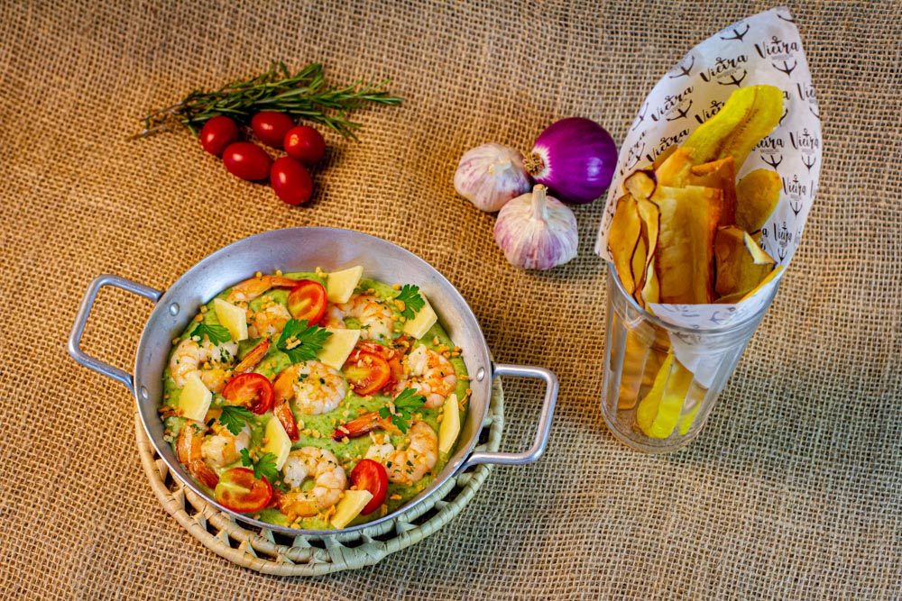 Camarão Mar e Terra Camarões salteados no azeite e alho, em cama de creme de espinafre, lascas de parmesão e mix de chips diversos.
